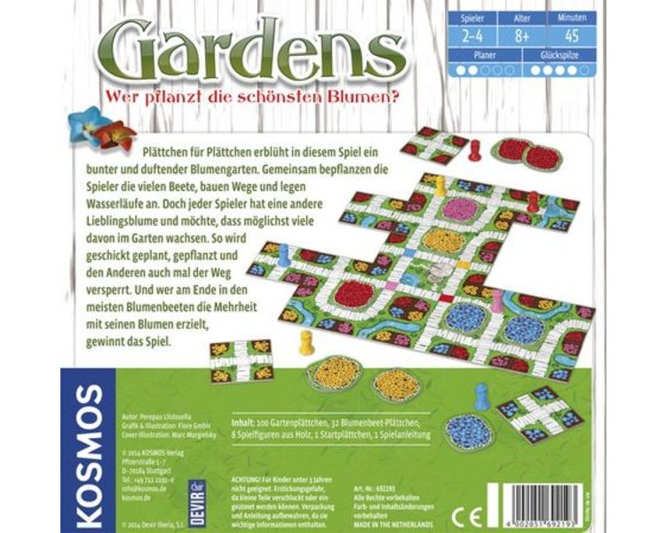 Gemeinsam gestalten und bepflanzen die Spieler einen Garten – Plättchen für Plättchen wächst er immer weiter. Es entstehen neue Wege und immer mehr Beete wollen bepflanzt werden. Wer mit Hilfe seiner beiden Gärtnerfiguren deren Lieblingspflanzen am geschicktesten im Garten platziert und die Mehrheit in den meisten Beeten erzielt, gewinnt. Einfache Regeln versprechen: auspacken und sofort loslegen.