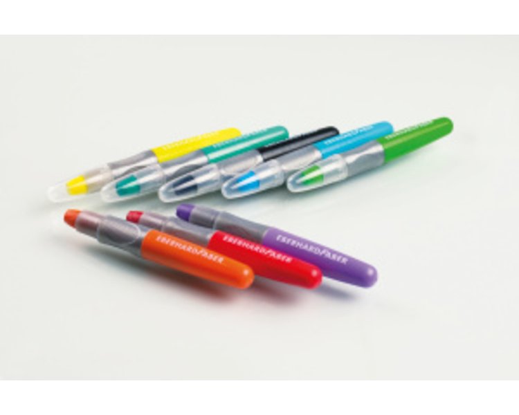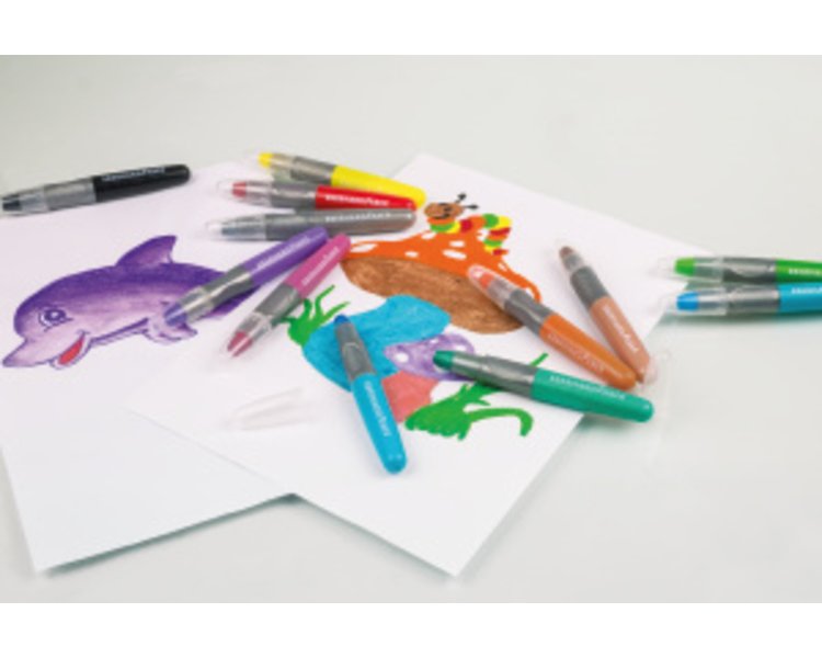 Ein echtes Malerlebnis bieten die Gelmalstifte. Die superweichen Gelminen in leuchtenden Farben lassen sich problemlos aus den Schiebehülsen drehen. Die Hüllen gewährleisten eine einfache und saubere Handhabung der Stifte und schützen die Gelmine vor dem Abbrechen. Falls die Mine aus Versehen etwas zu weit herausgedreht wurde, lässt sie sich ohne Aufwand wieder zurückschrauben. Also einfach drehen, malen und wunderschöne farbintensive Kunstwerke gestalten. Die Gelmalstifte sind perfekt zum großflächigen Ausmalen und liegen gut in der Hand – ideal für kleine Kinder.