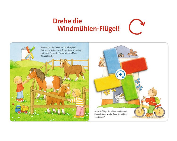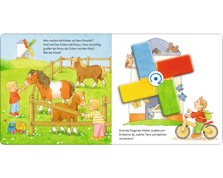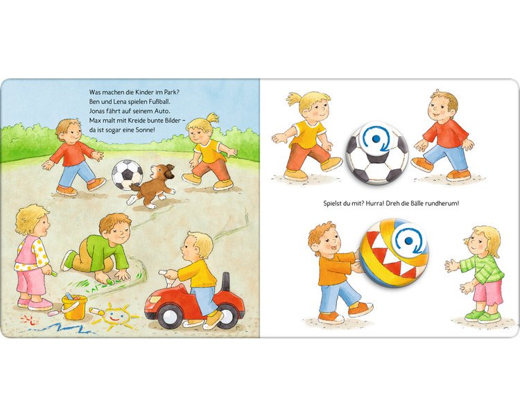 Rundherum und hin und her – hier können die Kleinen große Motive drehen und schieben. Ein besonderes Spielbuch für Groß und Klein mit bunten Bällen, flatternden Drachen, einer großen Windmühle, die sich dreht, und vielem mehr.