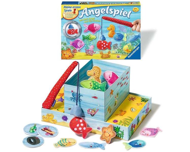 Mit der kleinkindgerechten Klett-Angel aus weichem, hochwertigem Material können schön die Allerkleinsten ihre Angelkünste unter Beweis stellen. Und ganz nebenbei trainieren die Spieler ihre Geschicklichkeit, Koordination und Feinmotorik. Vier Spielvarianten garantieren Spielspaß für kleine Angler von 2 bis 5 Jahren.