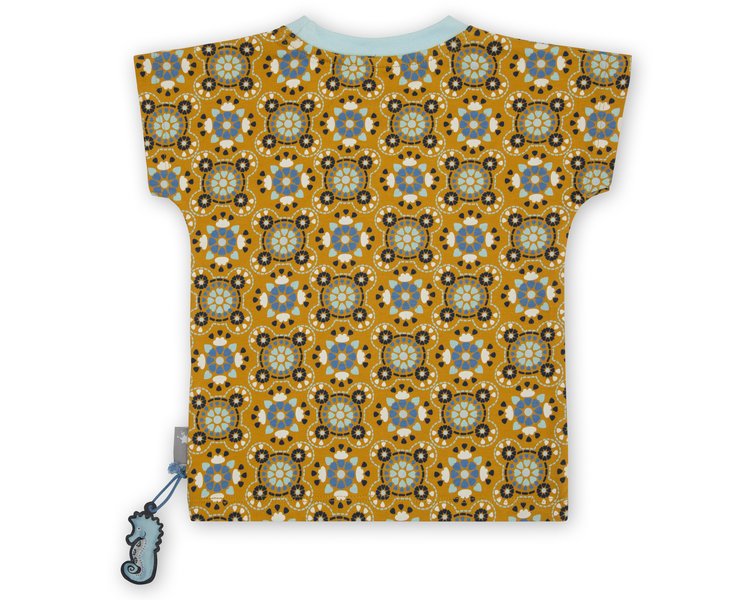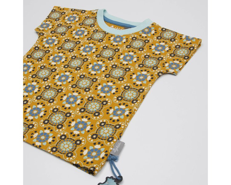 Modefarbe Curry für junge Fashionistas: das unkomplizierte Mädchen T-Shirt zeigt ein Herzchenmotiv mit allen Blautönen unserer aktuellen Kollektion. Ein schönes Top zum Kombinieren, das durch sein Muster auch mal kleine Fleckchen versteckt. Lässige Form mit angeschnittenen Ärmeln, in softer Bio-Baumwollqualität.