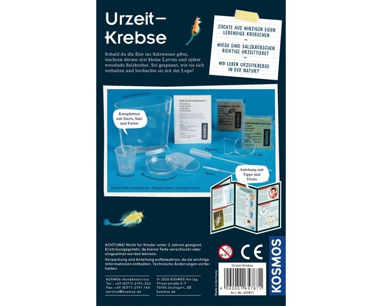 Die Urzeit zieht ins Kinderzimmer ein! Mit diesem KOSMOS Experimentierset züchten Kinder Krebse aus der Zeit der Dinosaurier einfach selbst. Los geht´s! Um die Salzkrebschen zum Leben zu erwecken, wird das Zuchtbecken mit Wasser und Salz vorbereitet und an einen warmen Platz gestellt. Vom Ei, über die Larve bis hin zu lustig wuselnden Urzeit-Krebsen – mit der Lupe ausgestattet sind die Kinder bei allen Schritten mit dabei und beobachten täglich aufregende Veränderungen.