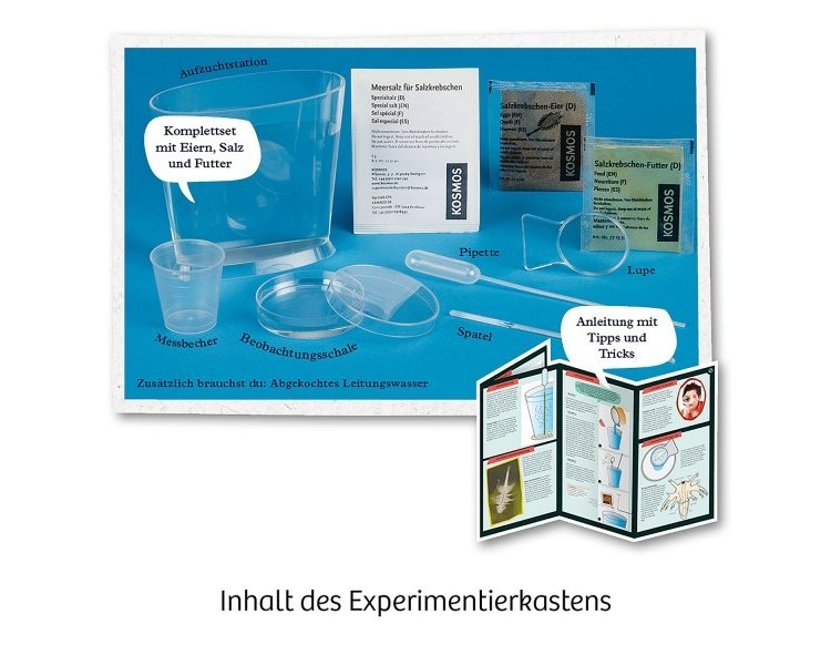 Inhalt: Anleitung, Salzkrebschen-Eier, Futter, Meersalz, Aufzuchtstation, Messbecher, Beobachtungsschale, Spatel, Pipette, Lupe
