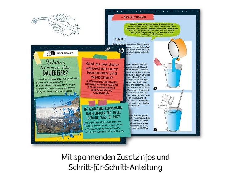 Die farbige Anleitung erklärt in einfachen Schritten, wie die Aufzucht und Pflege funktioniert und enthält interessante Zusatzinfo über die kleinen Urzeittiere.