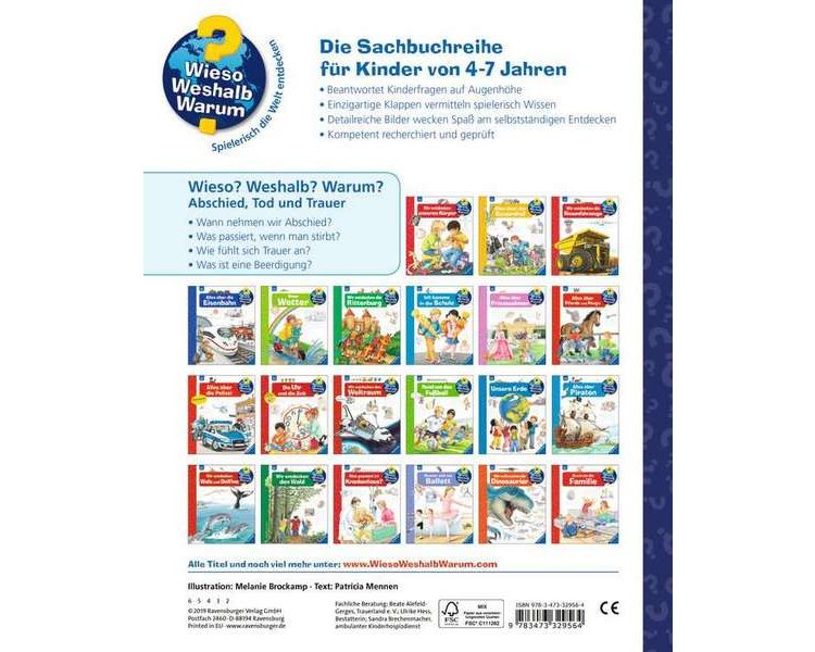 Der Tod macht uns sprachlos, doch Kinder fragen trotzdem: Was passiert, wenn man stirbt? Wie trauern wir? Darf ich lachen, wenn ihr traurig seid? Was ist eine Beerdigung? Dieses Buch bietet Antworten und hilft dabei, mit Kindern offen und ehrlich über den Tod zu sprechen. Mit einfühlsamen Bildern und Sachtexten.Wieso? Weshalb? Warum?Die Sachbuchreihe für Kinder von 4–7 JahrenJeden Tag entdecken Kinder etwas Neues – da kommen viele Fragen auf. Warum sind die Dinosaurier ausgestorben? Wo ist die Sonne in der Nacht? Wozu brauchen wir das Blut? Die beliebte Sachbuchreihe Wieso? Weshalb? Warum? gibt Kindern Antworten auf Augenhöhe. Dabei werden die unterschiedlichsten Themen aus der Alltags- und Interessenswelt der Kinder altersgerecht und mit viel Liebe zum Detail unter die Lupe genommen.Detailreiche Bilder, verständliche Sachtexte und überraschende Klappen, die Bewegungen oder Abläufe veranschaulichen und hinter die Dinge blicken lassen, ermöglichen Kindern, sich ihre Themen selbst zu erschließen. Der Spaß am eigenhändigen Entdecken, die liebevolle Umsetzung und die qualitativ hochwertige Ausstattung garantieren langanhaltende Freude an jedem einzelnen Buch.