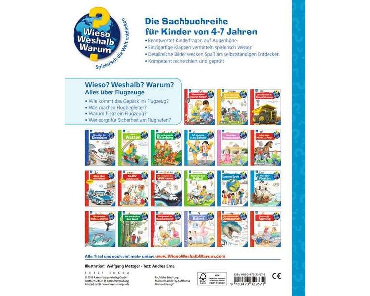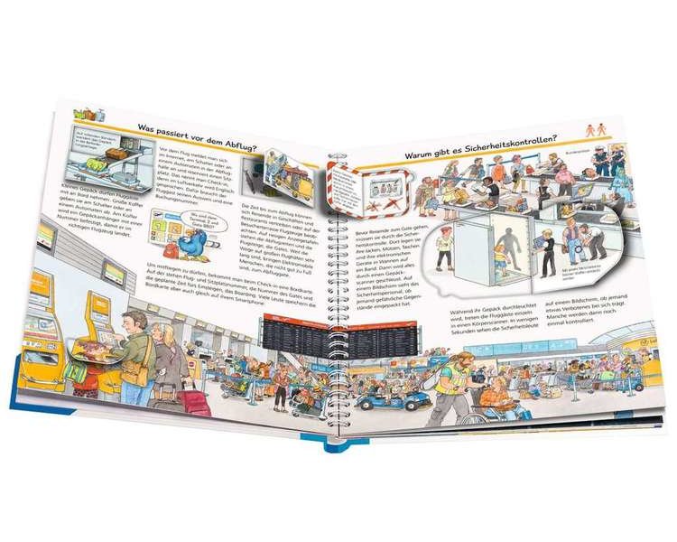 Was passiert beim Check-in und bei der Sicherheitskontrolle? Wie kommt das Gepäck an Bord? Und warum fliegt ein Flugzeug? Viele Familien fliegen in den Urlaub. Dabei staunen alle Kinder über das Gewimmel auf dem Flughafen. In diesem Buch erfahren sie alles über die Technik, Spezialfahrzeuge, Flugzeuge sowie die Menschen, die in und mit Flugzeugen arbeiten. Zahlreiche Klappen ermöglichen einen spannenden Blick hinter die Kulissen.Wieso? Weshalb? Warum?Die Sachbuchreihe für Kinder von 4–7 JahrenJeden Tag entdecken Kinder etwas Neues – da kommen viele Fragen auf. Warum sind die Dinosaurier ausgestorben? Wo ist die Sonne in der Nacht? Wozu brauchen wir das Blut? Die beliebte Sachbuchreihe Wieso? Weshalb? Warum? gibt Kindern Antworten auf Augenhöhe. Dabei werden die unterschiedlichsten Themen aus der Alltags- und Interessenswelt der Kinder altersgerecht und mit viel Liebe zum Detail unter die Lupe genommen.Detailreiche Bilder, verständliche Sachtexte und überraschende Klappen, die Bewegungen oder Abläufe veranschaulichen und hinter die Dinge blicken lassen, ermöglichen Kindern, sich ihre Themen selbst zu erschließen. Der Spaß am eigenhändigen Entdecken, die liebevolle Umsetzung und die qualitativ hochwertige Ausstattung garantieren langanhaltende Freude an jedem einzelnen Buch.