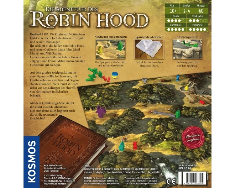 Nominiert zum Spiel des Jahres 2021! England 1193. Die Grafschaft Nottingham leidet unter dem Joch des bösen Prinz John und seiner Handlanger. Ihr schlüpft in die Rollen von Robin Hood und seiner Gefährten Little John, Maid Marian und Will Scarlet. Gemeinsam stellt ihr euch in diesem Spiel dem Unrecht entgegen und kommt dabei einem dunklen Geheimnis auf die Spur. Auf dem großen Spielplan könnt ihr eure Figuren völlig frei bewegen, mit Dorfbewohnern sprechen und Gegenstände erkunden. Stets müsst ihr euch dabei vor den Schergen des Sheriffs von Nottingham in Sicherheit bringen. Aufbauen und losspielen ihr startet sofort ins erste Abenteuer. Das im Brettspiel enthaltene Buch begleitet euch durch die spannende Geschichte. Ein tolles Geschenk nicht nur für Robin-Hood-Fans!