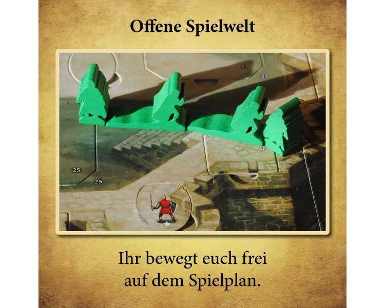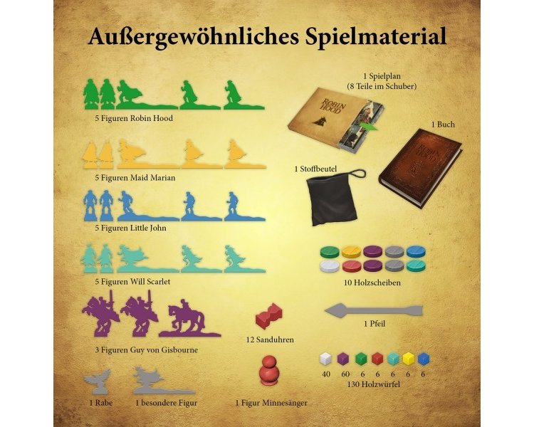 Inhalt: 1 großer Spielplan, 1 Hardcover-Buch, 26 Holzfiguren, 130 Holzsteine, 10 Holzscheiben, 1 Holzpfeil, 12 Holz-Sanduhren, 1 Beutel, 1 Starter-Blatt, 1 Begleitheft