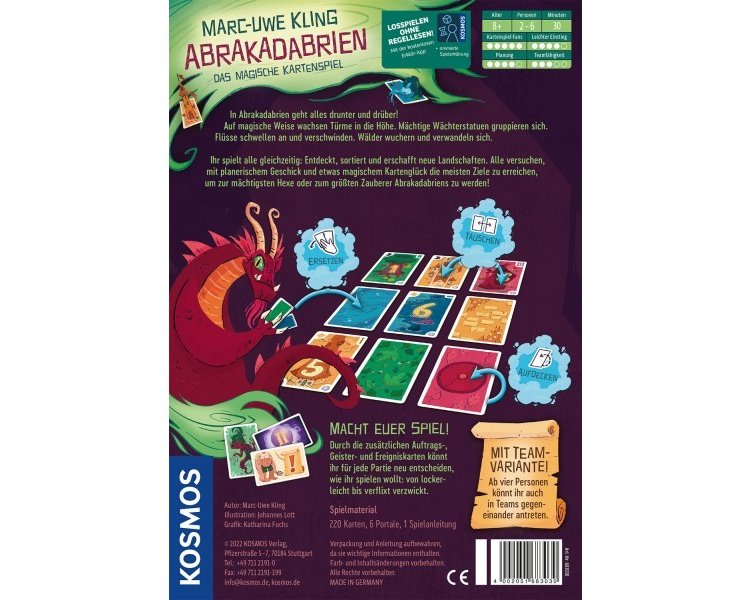 In Abrakadabrien ist ganz schön was los! Auf wundersame Weise entstehen Türme und stürzen wieder in sich zusammen, Flüsse schwellen an und verschwinden wieder, Wälder wachsen und verwandeln sich. 2-6 Spielerinnen und Spieler sind in diesem Kartenspiel damit beschäftigt ihre magischen Landschaften zu erschaffen. Zusätzliche Schatz-, Ereignis- und Auftragskarten sorgen für noch größeren Spielspaß. Die Regeln und der Einstieg sind einfach und alle spielen gleichzeitig. Das Ziel? Das eigene Gebiet hin- und herschieben, verwandeln und dabei Punkte sammeln. Das neue coole Kartenspiel von Erfolgsautor Marc-Uwe Kling für die ganze Familie.