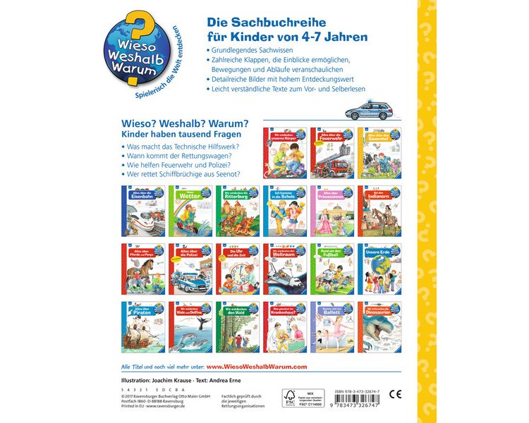 Welche Personen sind in Notsituationen gefragt und wie sieht ihre Arbeit aus? Dieser Band begleitet die Retter unterschiedlicher Organisationen, wie die Feuerwehr, die Polizei, den Notarzt oder die Bergwacht, bei ihren Einsätzen. Auch über die Arbeit des Technischen Hilfswerks im In- und Ausland erfahren die Kinder Spannendes. Und natürlich lernen sie spezielle Ausrüstungen und Gerätschaften der einzelnen Organisationen kennen.