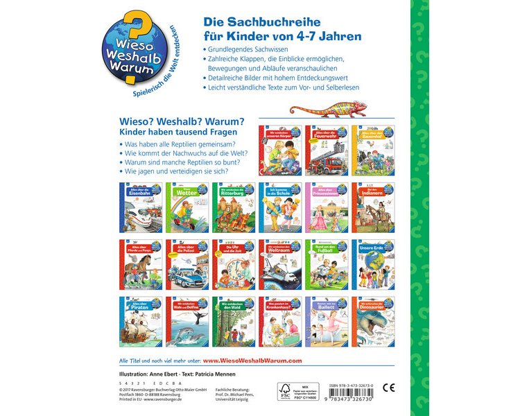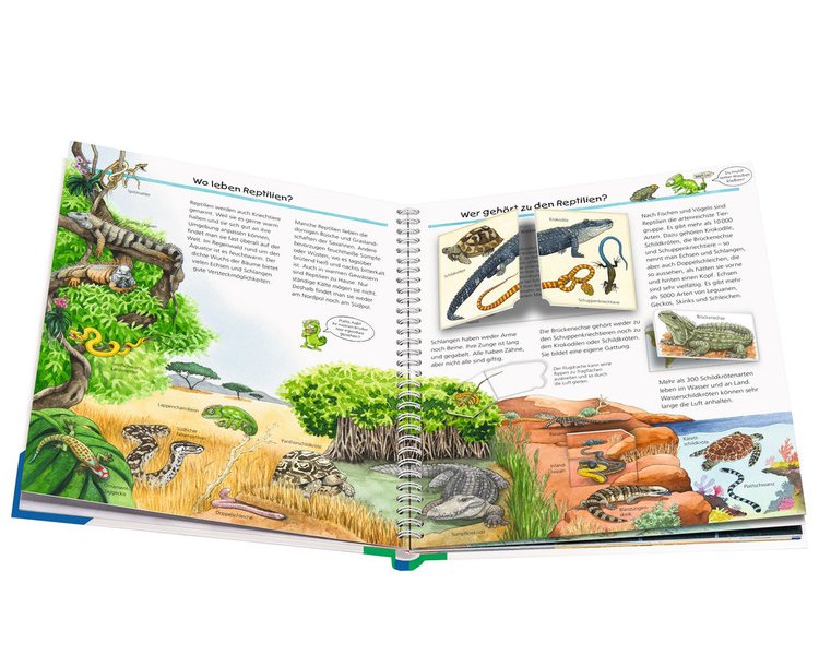 Reptilien wie Krokodile, Echsen und Schlangen gehören für Kinder zu den spannendsten Tieren der Erde: von klein bis groß, alle urtümlich, viele geheimnisvoll, manche wohlig-gruselig, andere sympathisch-niedlich. Eindrückliche Klappen zeigen ihre Merkmale und Fähigkeiten: von Besonderheiten bei der Fortbewegung über die Balz und den Nachwuchs bis hin zu Verteidigungs- und Jagdstrategien.