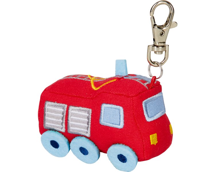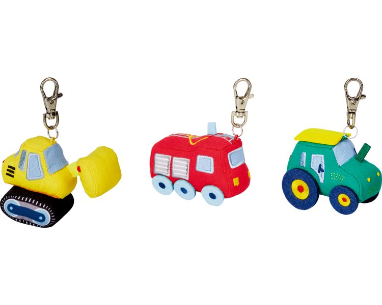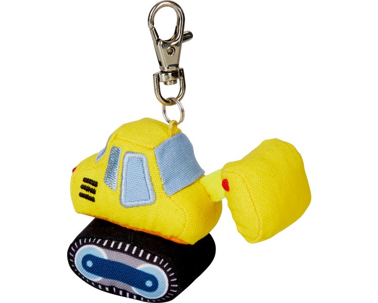 Cooler Stoffanhänger für Fahrzeugfans. Mit Karabineranhänger zur Befestigung an Rucksack oder Schlüsselbund. In 3 Designs: Als Bagger, Traktor oder Feuerwehrauto.