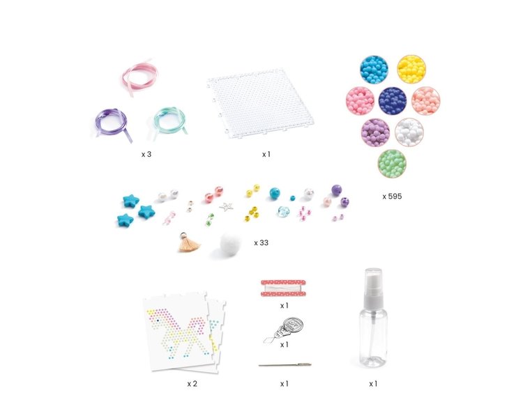 Inhalt: 1 Arbeitsunterlage, 1 Sprühflasche, 1 abgestimmte Auswahl an Kunststoffkügelchen, die durch das Einwirken von Wasser kleben (8 Farben), Perlen und Anhänger, transparentes und elastisches Garn, Bänder, 1 Nadel, 1 Einfädler, 1 Schritt-für-Schritt-Anleitung in Farbe.