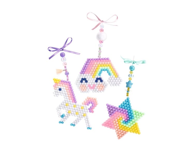 Ein Set zur Gestaltung von 3 pastellfarbene Hängeampeln mit Kügelchen, die durch Wassereinwirkung kleben. Das Kind legt die Vorlage unter die transparente Wabenplatte. Die farbigen Perlen werden so auf die Platte gelegt, wie es die jeweilige Vorlage vorgibt, und dann mit Wasser besprüht. Nach dem Trocknen bleiben die Kügelchen wie von Zauberhand fest miteinander verbunden! Anschließend werden die Perlen und Anhänger auf das Band gefädelt, um die Kreationen in hübsche Anhänger zu verwandeln.