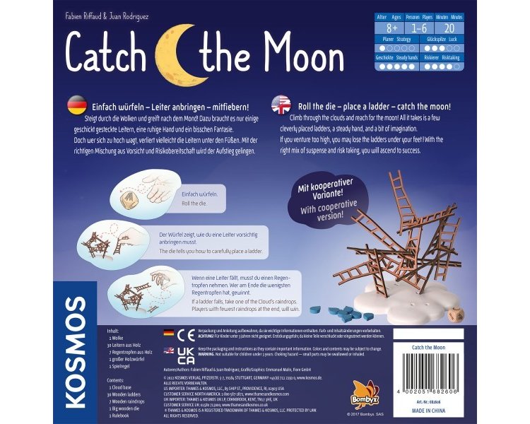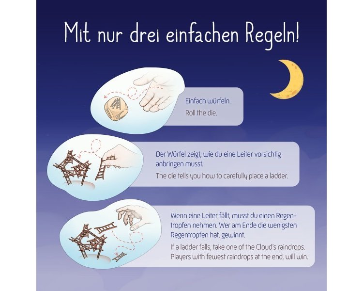 Hoch hinaus! Wem gelingt es, die höchste Leiter zu bauen und nach dem Mond zu greifen? Schnell sind die Regeln erklärt und es kann sofort mit dem Zusammenstecken der Leitern begonnen werden. Der Würfel gibt vor, wie die nächste Leiter auf kreative Weise am Leiterturm angebracht werden muss. Dazu benötigen die 1-6 Spielerinnen und Spieler ab 8 Jahren in diesem Geschicklichkeitsspiel ein wenig Glück, Fantasie und ein ruhiges Händchen. Doch wer sich zu hoch wagt riskiert, dass beim Anbauen etwas hinunterfällt. Dann kassiert man einen Regentropfen. Wer bis zum Spielende die wenigsten Regentropfen sammelt, gewinnt dieses aufregende Spiel. Ein cooles Geschicklichkeitsspiel mit viel Spaß für die ganze Familie.
