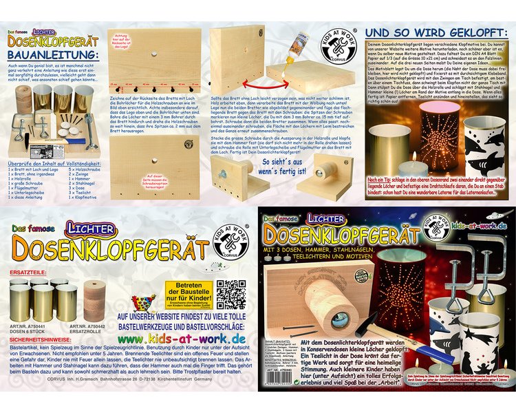 Ein Bausatz. Auf eine Dose wird ein Motiv mit Klebefilm angebracht. Dann werden auf dem Dosenlichter-Klopf-Gerät mit einem Nagel kleine Löcherin die Dose geschlagen. Ein Teelicht in der Dose krönt das fertige Werk.