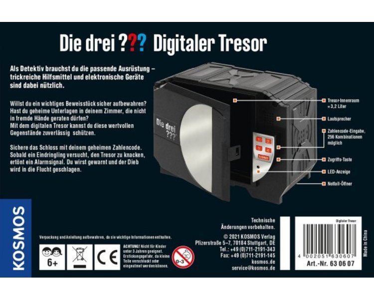 Nicht nur die drei Detektive aus Rocky Beach, Justus Jonas, Peter Shaw und Bob Andrews, brauchen einen sicheren Aufbewahrungsort für geheime Dokumente, wichitge Indizien und gesicherte Beweise. Auch Nachwuchs-Detektive ab acht Jahren müssen vertrauliche Dinge vor unbefugtem Zugriff schützen! Im Digitalen Tresor sind alle Geheimnisse sicher, denn er kann nur mit einem selbst einstellbaren, vierstelligen Code geöffnet werden. Wenn Diebe am Werk sind ertönt ein Alarm, der den Besitzer auf den Plan ruft. So kann der Einbrecher schnell gefasst werden - Fall gelöst!
