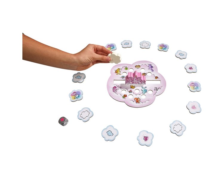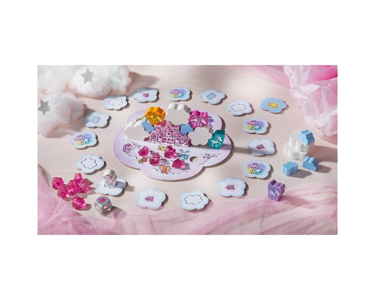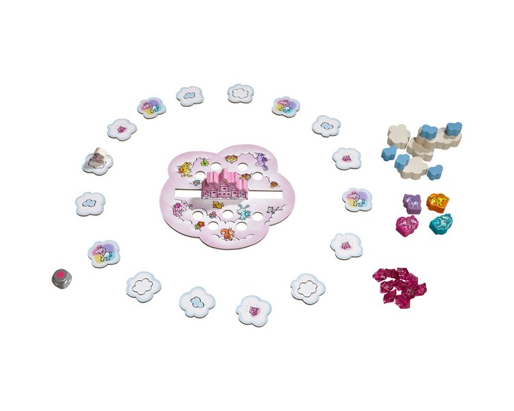 • Wolken-Spielplan in Tischmitte legen und Wolkenschloss in Aussparung stellen, Wolkenplättchen mit heller Seite um den Wolken-Spielplan auslegen, Rosalie auf ein beliebiges Plättchen stellen; Einhörner, Wolkenkristalle und Wolken als Vorrat bereithalten.