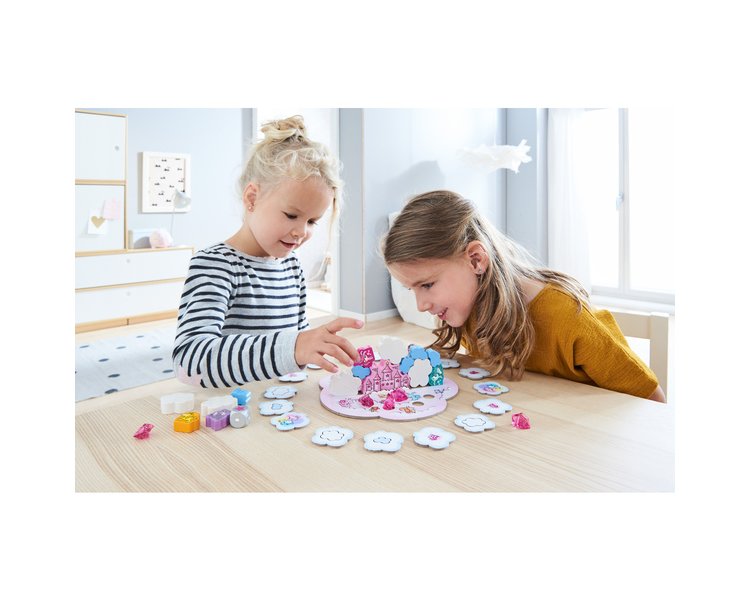 Wenn die fünf Einhörner Besuch von Freunden bekommen, wird es schon mal eng im Wolkenschloss. Um Platz zu schaffen, müssen die unterschiedlich großen Wolken und Einhörner vorsichtig rund um das Schloss gestapelt werden. Das erfordert Fingerspitzengefühl! Bei dem kooperativen Würfelspiel Einhorn Glitzerglück – Wolkenstapelei von HABA spielen die Kinder nicht gegeneinander, sondern miteinander – gemeinsam versuchen sie durch geschicktes Stapeln der Holzfiguren, alle Gäste im Schloss unterzubringen. Wenn sie es schaffen, die Figuren richtig zu stapeln und alle funkelnden Wolkenkristalle auf dem Wolken-Spielplan zu sammeln, gewinnen sie gemeinsam das Spiel. Aber Achtung vor den gefährlichen Gewitterwolken-Plättchen!