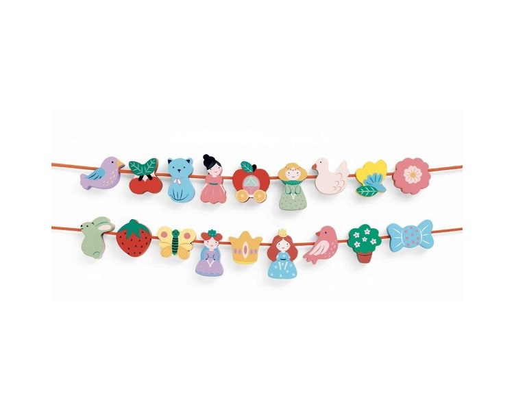Wunderschön bemalte Holzperlen zum Thema Natur. Das Kind kann seiner Fantasie freien Lauf lassen, wenn es die Perlen auf die beiden Schnüre fädelt. Was für ein Spaß! Ideal ab einem Alter von 2 Jahren für erste Lernerfahrungen.