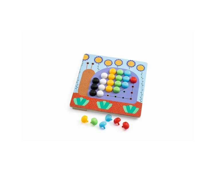Kinder können sich beim Stecken der Einzelteile an der farbigen Vorlage orientieren. Dabei wird eine von den 8 Karten aus Pappe auf das Holzbrett befestigt. Nach den Vorgaben werden die Stecker in verschiedenen Farben auf die Motive gesteckt.