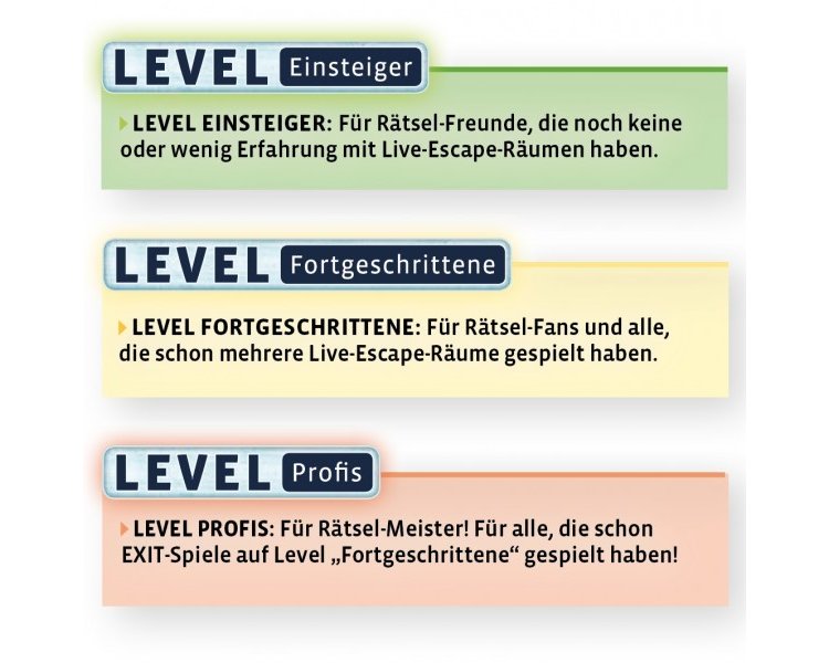Bei „EXIT – Das Spiel“ entdecken die Spieler mit etwas Kombinationsgabe, Teamgeist und Kreativität nach und nach immer mehr Gegenstände, knacken Codes, lösen Rätsel und kommen der Freiheit Stück für Stück näher. Dabei müssen auch ungewöhnliche Wege beschritten werden. So darf das Material geknickt, beschriftet oder zerrissen werden. Ist das Geheimnis einmal gelüftet, kann das Event-Spiel kein zweites Mal gespielt werden. Das macht den Spieleabend zu einem besonderen Highlight.