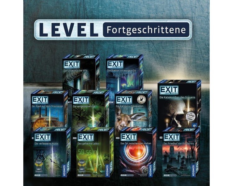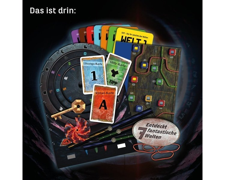 Mystery! Was versteckt sich hinter dem unheimlichen Tor in der Höhle? Von Neugier getrieben und mit einem mulmigen Gefühl im Bauch bewegen sich die Spieler auf ein dunkles Tor zu. Plötzlich werden sie hineingezogen und alles wird schwarz um sie herum. Als sie wieder zu Bewusstsein kommen, befinden sie sich nicht mehr in der Höhle, sondern in einer düsteren, fremdartigen Umgebung! Wie sollen sie jetzt den Weg zurück in die vertraute Welt finden? Nur im Team kommen die ein bis vier Spieler sicher nach Hause. Dafür müssen sie Rätsel lösen, Schlösser öffnen, clever kombinieren und im Team zusammenarbeiten. Die Spannung steigt – nur gemeinsam werden sie in die Realität zurückkommen! Ein neues Abenteuer aus der Reihe Spiele für Erwachsene „EXIT – Das Spiel“, im Level „Fortgeschrittene“.