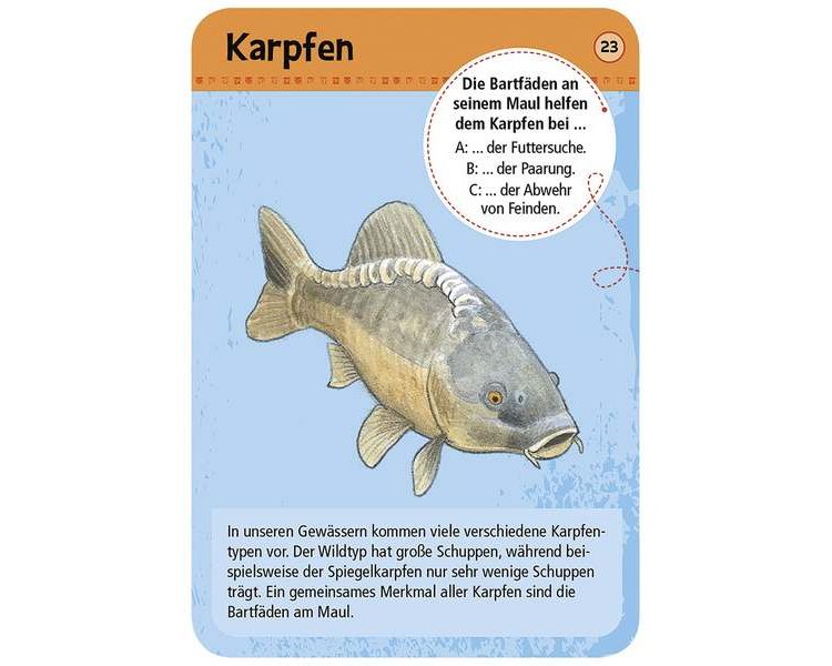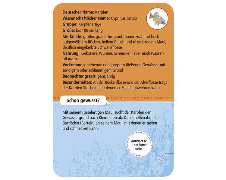 Viele Kinder (und Erwachsene!) kennen heute nicht mehr die Namen der heimischen Fische, Kleintiere, Vögel und Pflanzenan Bach und Teich. Diese wunderschön gestaltete Schachtel mit 50 Karten und einem ausführlichen Leporello kann da Abhilfe schaffen. Sie setzt die erfolgreiche Reihe fort und ist nützlicher Begleiter in der Natur. Neben Infos zu Bach und Teich bietet sie spannende Quizfragen – nicht nur für Kinder!