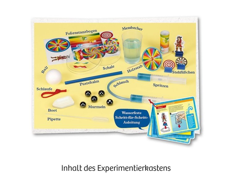 Kann Wasser um die Ecke fließen? Was ist das Geheimnis der Hydraulik? Wie funktioniert eine Taucherglocke? Mit KOSMOS wird die Badewanne zum Experimentierplatz, denn rund ums Wasser lassen sich viele erstaunliche Entdeckungen machen! Mit tollen Materialien wie Spritzen, Schläuchen, Messbechern, Murmeln und vielem mehr erforschen Kinder mit diesem Experimentierkasten, wie ein Berg aus Wasser entsteht. Sie finden heraus, warum sich ein Wasserrad dreht und beobachten, wie Seife ein Boot in Fahrt bringt.