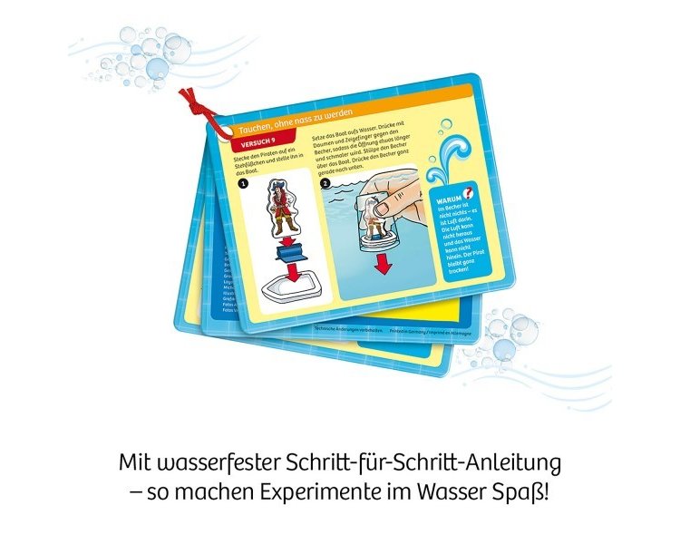 Experimentieren ohne Lesekenntnisse: Die wasserfeste, farbige Anleitung erklärt in übersichtlichen Bildern, wie die Versuche funktionieren. Sie kann sogar mit ins Wasser genommen werden.
