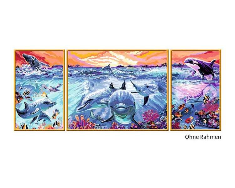 1 Maltafel im Format 50x40 cm und 2 Maltafeln im Format 25x40 cm (Gesamtgröße: 100x40 cm), Acrylfarben auf Wasserbasis in wiederverschließbaren Näpfchen, Doppelpinsel, Farbpalette, Vorlageblatt, Glanzlack und Anleitung