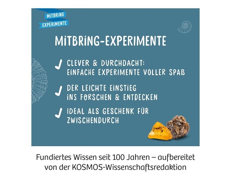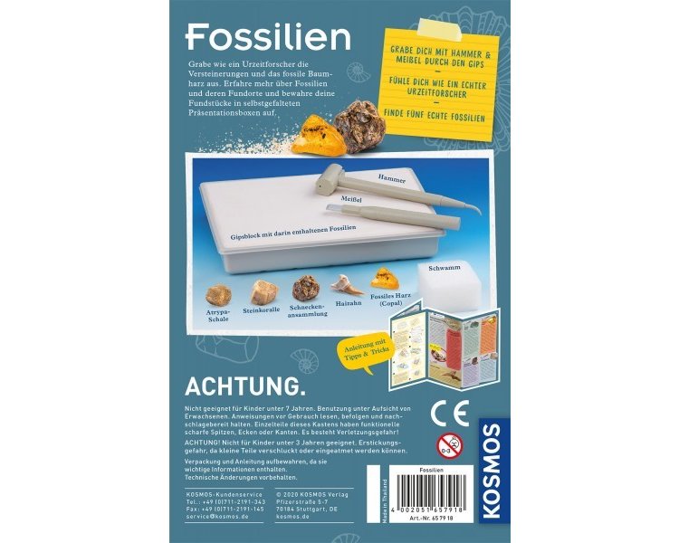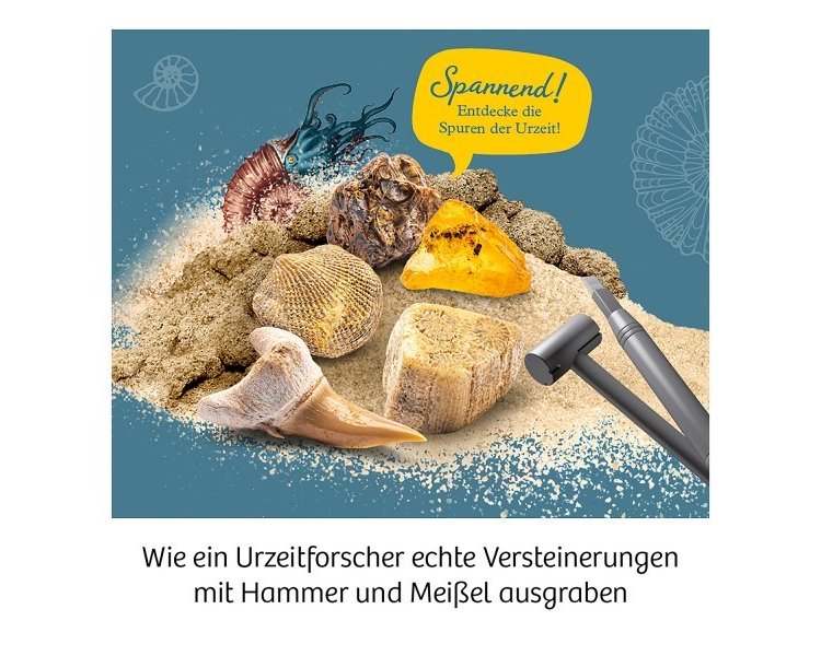 Graben, entdecken, staunen – mit diesem Set geht’s auf eine spannende Zeitreise! Einfach unglaublich, dass sich echte Fossilien, wie Haizahn, Steinkoralle, Atrypa-Schale, Schnecken und Bernstein in diesem Gips-Ausgrabungsblock verstecken. Mit Hammer und Meißel graben sich kleine Urzeit-Forscher behutsam durch die unterschiedlichen Gipsschichten. Das geht ganz einfach mit der Anleitung: Sie erklärt den Kindern, wie sie bei ihren Erkundungen am besten vorgehen und beantwortet viele Fragen, die beim Spielen rund um das Thema Fossilien entstehen. Die tollen Fossilien-Funde sollen natürlich auch Freunde, Geschwister und Eltern bewundern! Im Handumdrehen sind schöne Präsentationsschachteln gebastelt, die das Kinderzimmer in ein kleines Museum verwandeln.