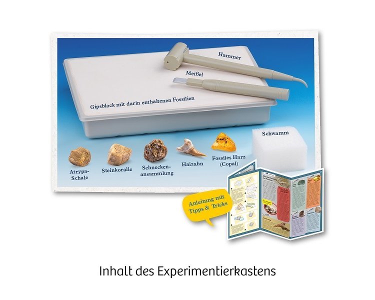 Inhalt: Gipsblock mit 5 Fossilien (Hai-Zahn, Steinkoralle, Schnecken, Atrypa-Schale, Fossiles Harz (Copal) ), Werkzeug (Hammer, Meißel), Schwamm