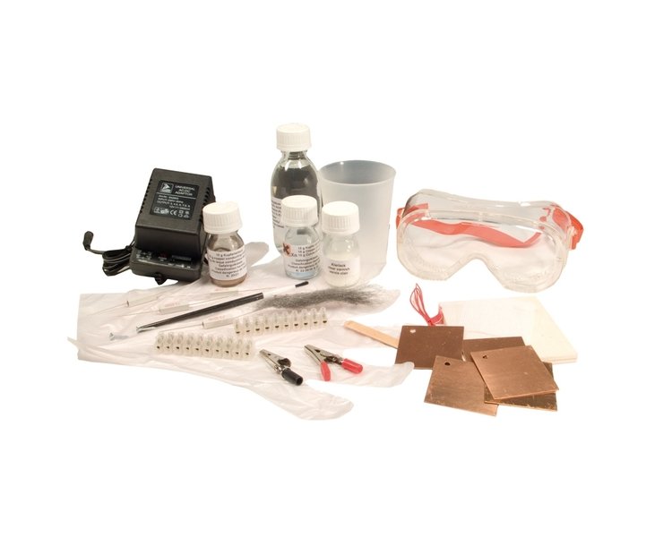 Ein DIY-Experimentierset zum Verkupfern von Gegenständen mit einer Oberfläche von ca. 5 cm² bis 50 cm², z.B. einen Schlüssel, den ersten Milchzahn, Blätter oder Früchte. Organische Produkte werden durch das Verkupfern haltbar gemacht und können auch wieder wie 'echt' bemalt werden, z.B. als Dekoration in einer Obstschale. Es können auch nicht leitende Gegenstände verkupfert werden, wenn sie vorher mit Kupferleitlack behandelt werden. Dieses Set enthält alle Materialien, die für die ersten Galvanisierversuche benötigt werden.