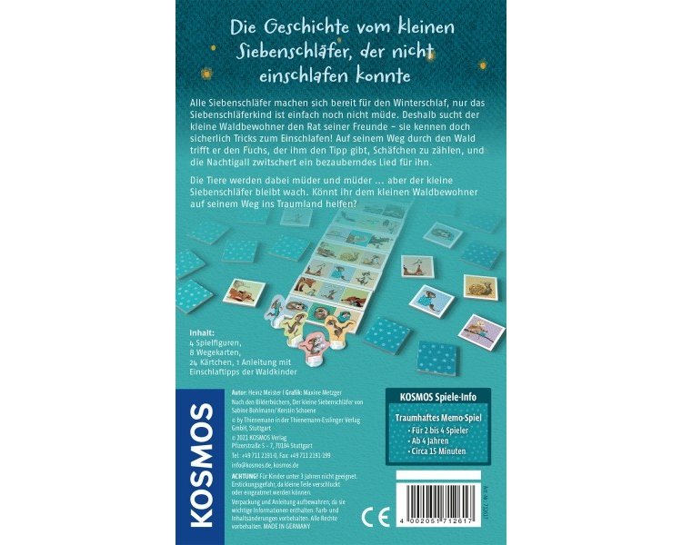 Schlaf, kleiner Siebenschläfer, schlaf! Alle machen sich bereit für den Winterschlaf, nur das Siebenschläferkind ist noch gar nicht müde. Wer kann dem Kleinen helfen? Die Spieler sind gefragt! Sie machen sich mit auf die Suche nach wertvollen Einschlaf-Tipps. Dafür bewegen sie bei diesem Brettspiel ihre Spielfigur auf der Wegleiste und decken Memo-Kärtchen auf, die ihnen weiterhelfen. Das passende Motiv wurde nicht gefunden? Dann versucht der nächste Spieler sein Glück. Auf ihrem Weg treffen die Kleinkinder auf Fuchs, Nachtigall, Schnecke und Co., die alles geben, um den Siebenschläfer ins Traumland zu bringen. Wer die letzte Wegkarte erreicht und die Karte mit dem gähnenden Siebenschläfer entdeckt, hat gewonnen! Ein wunderschönes Gesellschaftsspiel mit einer Geschichte rund ums Schlafen und Kuscheln für Kleinkinder, Eltern und Großeltern. Ein niedliches Geburtstagsgeschenk und Mitbringsel.