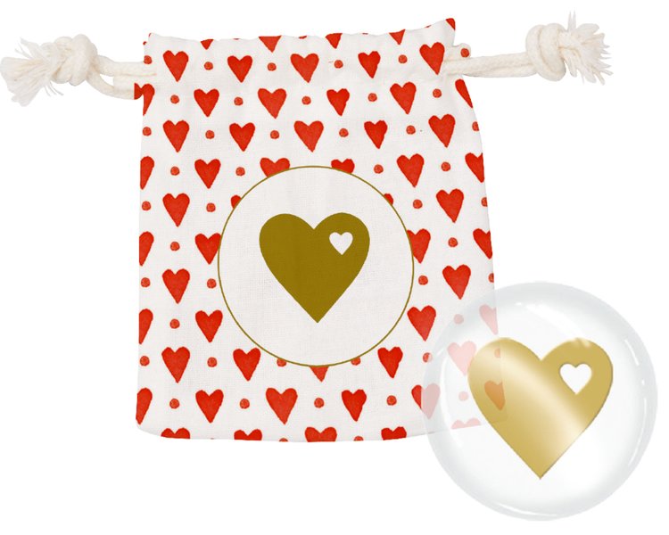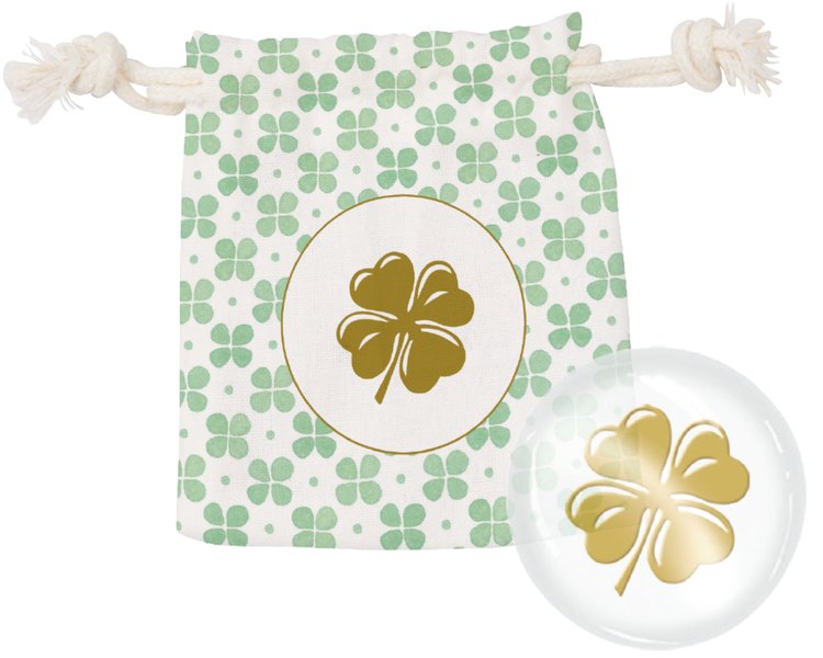 Kleiner Handschmeichler mit Glücks-Motiv als Glücksbringer für die Jacken- oder Handtasche. Aus Kunstharz und Metall. Im bedruckten Baumwollsäckchen.