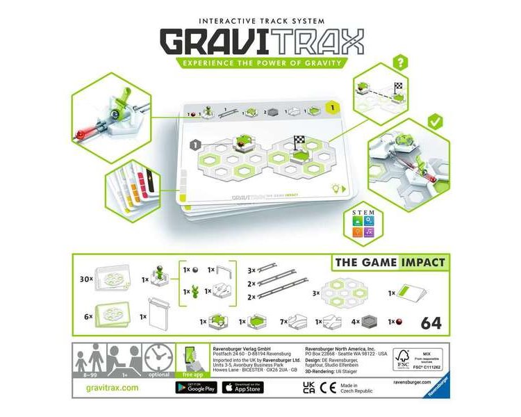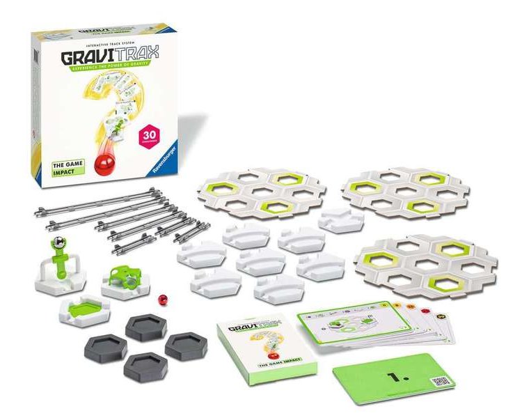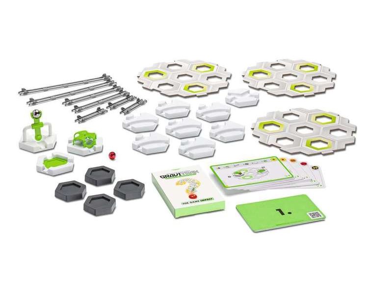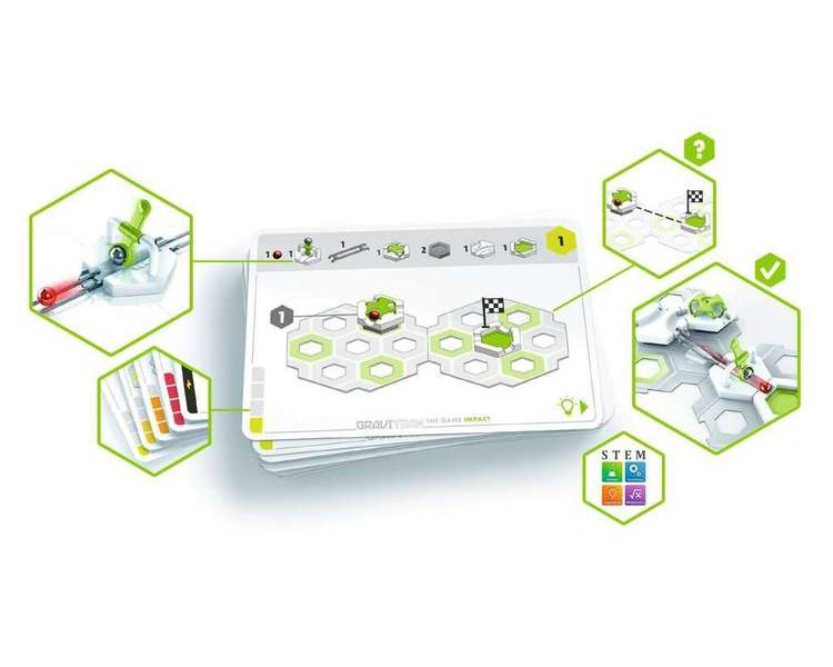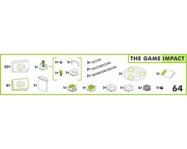 The Game besteht aus 30 Rätseln, die mithilfe von Aufgabenkarten gelöst werden müssen. Zu Beginn des Spiels wird die Position vom Startstein und Ziel angegeben. Wie muss die Bahn gebaut werden, dass die Kugel vom Start bis ins Ziel rollt? Es wird vorgegeben welche Elemente verwendet werden dürfen. Erreicht die Kugel das Ziel, ist die Aufgabe gelöst. In diesem Set steht der Action-Stein Hammer im Mittelpunkt. Er und weitere 27 Bausteine bringen Kinder bei The Game Impact zum Knobeln.