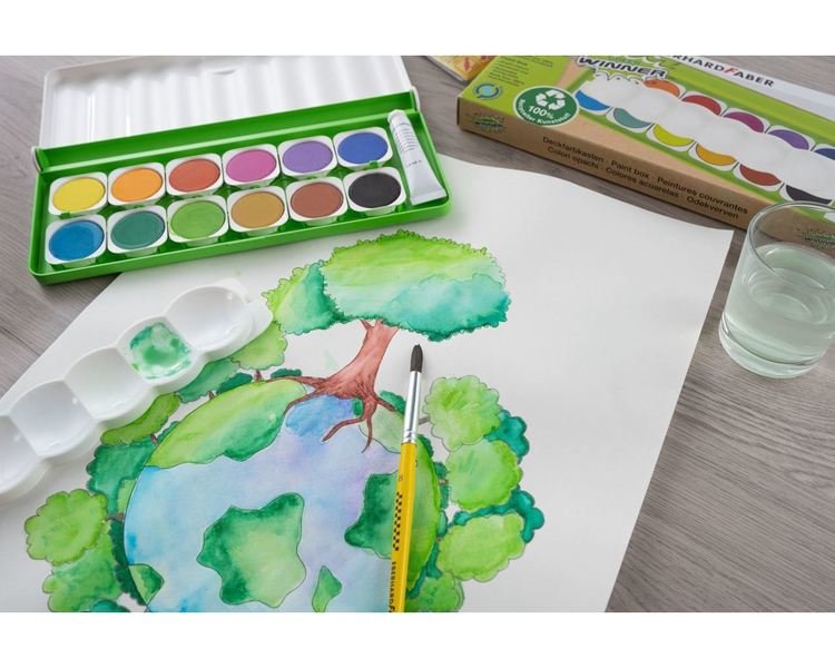 Der Green Winner Deckfarbkasten sollte in keiner Schultasche fehlen. Er besteht zu 100% aus recyceltem Kunststoff und enthält 12 Farbnäpfchen und eine Deckweißtube. Die Farbnäpfchen können ausgetauscht und umsortiert werden, sodass immer die passenden Farben nebeneinander liegen. Der transparente Deckel der stabilen Kunststoffbox kann abgenommen werden und lässt sich einfach reinigen. Der Deckfarbkasten enthält zusätzlich eine herausnehmbare Mischpalette.