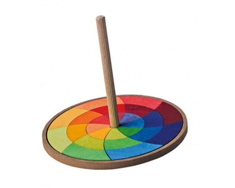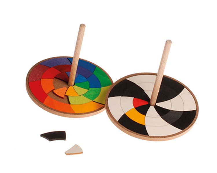 Hier können endlos Muster gelegt werden, aus denen sich wieder spannende neue Kreiselbilder ergeben. Die Farben werden beim Drehen gemischt. Wunderschön in Kombination mit Puzzleteilen von Handkreisel Monochrom 93130.