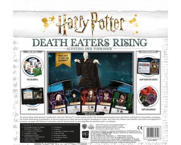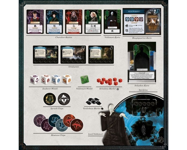 Inhalt: 1 3-D-Figur "Lord Voldemort", 44 Charakter-Karten, 1 Spielbrett, 6 Hauptquartier-Karten, 1 Bösewichtkarte, 6 Ortskarten, 14 Würfel, 1 8seitiger Voldemort-Würfel, 24 Zauberspruch-Chips, 60 Schadensmarker, 15 Verderbnismarker, 6 Missions-Chips