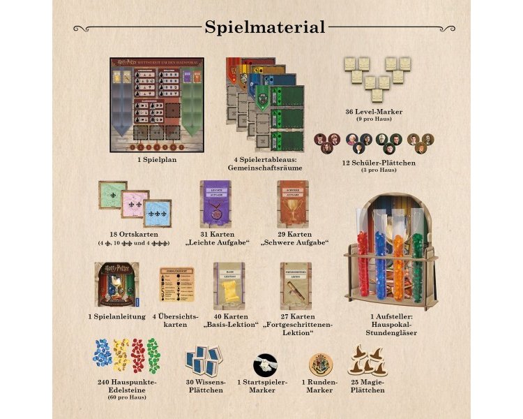 Inhalt: 1 Spielplan, 4 Ablagetafeln "Aufenthaltsraum", 12 Schüler-Chips, 36 Level-Marker, 18 Ortskarten, 40 Karten "Grundkurs", 27 Karten "Fortgeschrittene", 31 Karten "Leichte Aufgaben", 29 Karten "Schwere Aufgaaben", 30 Wissen-Marker, 25 Magie-Marker, 240 Haus-Punkte Edelsteine, 1 Hauspokal Stundenglas mit Aufsteller, 1 Startspieler-Marker, 1 Runden-Marker, 4 Übersichtskarten, 1 Spielanleitung
