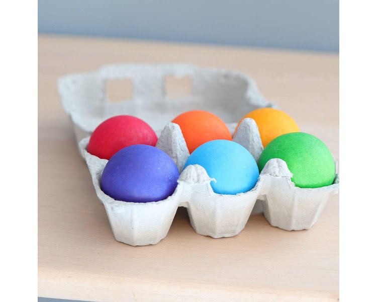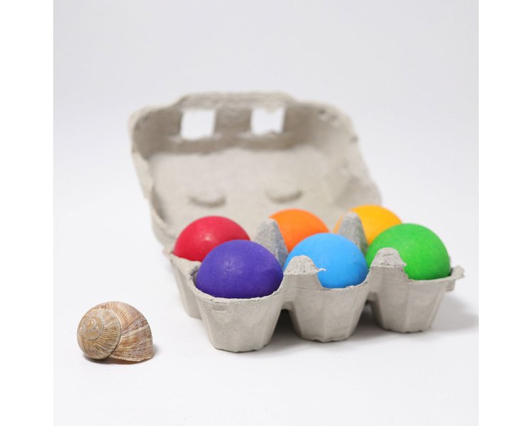 6 Massiv Holzkugeln, farblich passend zum Regenbogen (Art. Nr. 10700) und dem großen Kistensatz (10370). Wunderbar als Sortierspiel mit diesen Artikeln kombinierbar. Oder ideal für Murmelspiele mit den großen Regenbögen (10670/10673/10669/93050).