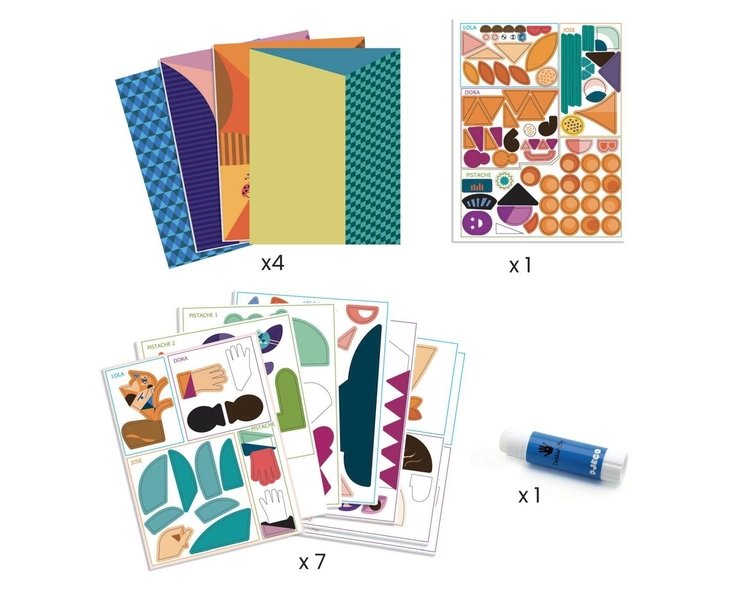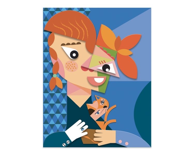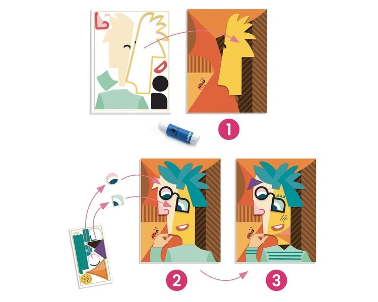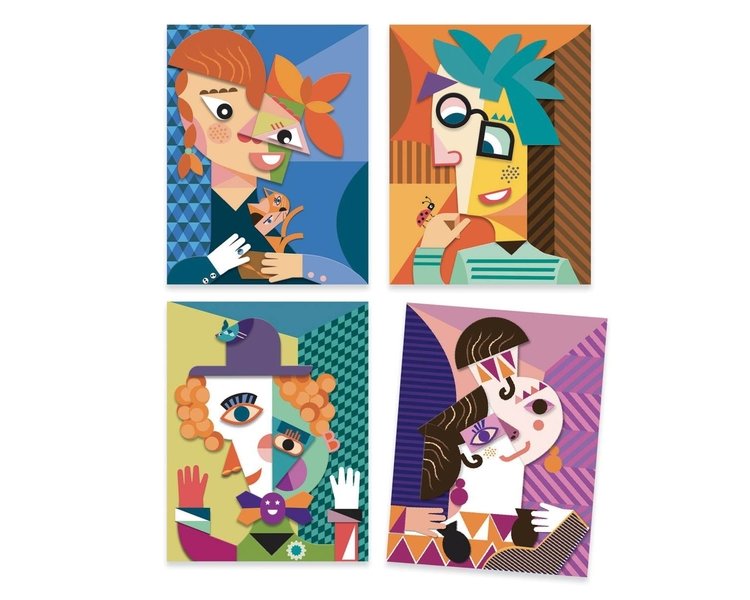 Ein Collageset, das Sie dazu einlädt, den Stil von Pablo Picasso, dem großen Meister des Kubismus, zu entdecken. Nach und nach werden die bedruckten Pappteile zusammengesetzt und übereinandergelegt, um 4 verfremdete bzw. deformierte Porträts zu komponieren, die mit den Perspektiven spielen. Was für lustige Figuren!