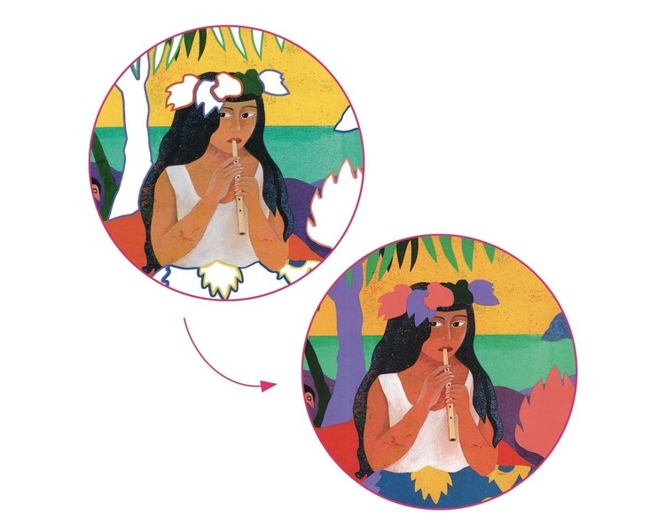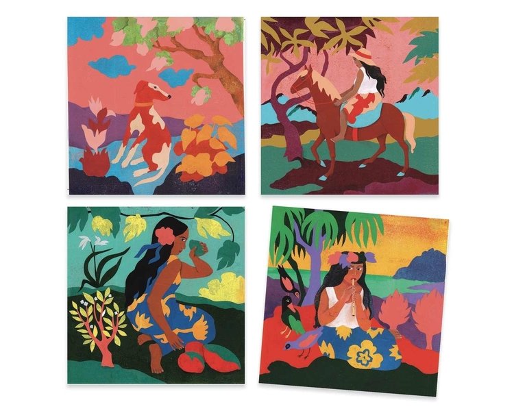 Eine Malset, das Dich dazu einlädt, den Malstil von Paul Gauguin, dem großen post-impressionistischen Meister, zu entdecken. Nach und nach werden die Bilder in Farbe getaucht und die Tahitianerinnen erwachen zum Leben.
