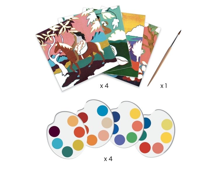 Inhalt: 4 illustrierte Karten aus Aquarellpapier (20 x 20 cm), 4 Farbpaletten aus dicker Pappe, 1 Pinsel, 1 Schritt-für-Schritt-Anleitung. In Farbe.