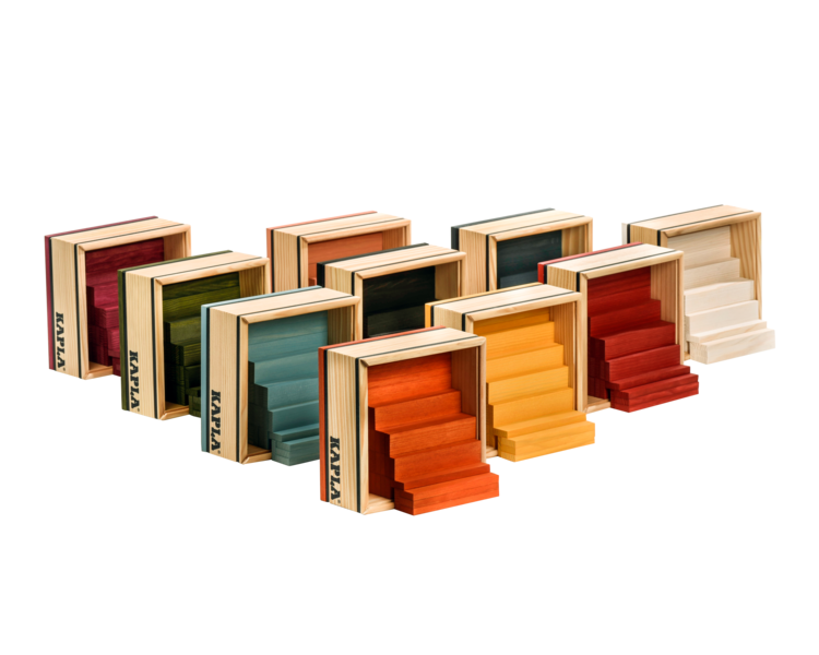 Ideal, um Ihre KAPLA® Kollektion zu erweitern: Sammeln Sie zehn hübsche Farbtöne in Ihren passenden Holzkisten!