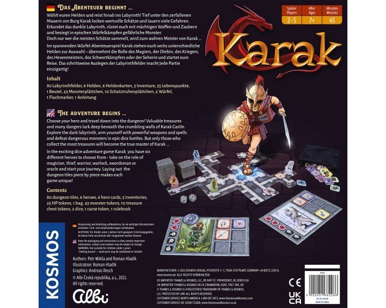 Welche Geheimnisse liegen tief unter den Ruinen von Burg Karak? Die Helden finden es in diesem spannenden Würfelspiel heraus! Auf der Suche nach dem großen Abenteuer reisen sie hinab in das unterirdische Labyrinth. Um wertvolle Schätze zu bergen, nutzen die Helden ihre besonderen Fähigkeiten und stürzen sich in dramatische Würfelkämpfe. Hinter jeder Ecke könnte das nächste Monster lauern! Stück für Stück entsteht so in jedem Spiel ein immer neues, einzigartiges Labyrinth. Wer überlistet seine Gegner, besiegt die Monster und gewinnt den Edelstein des Drachen? Das spannende Spiel für Kinder ab 7 Jahren ist ein tolles Geschenk zum Geburtstag.