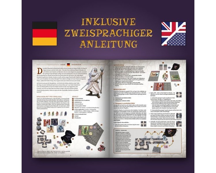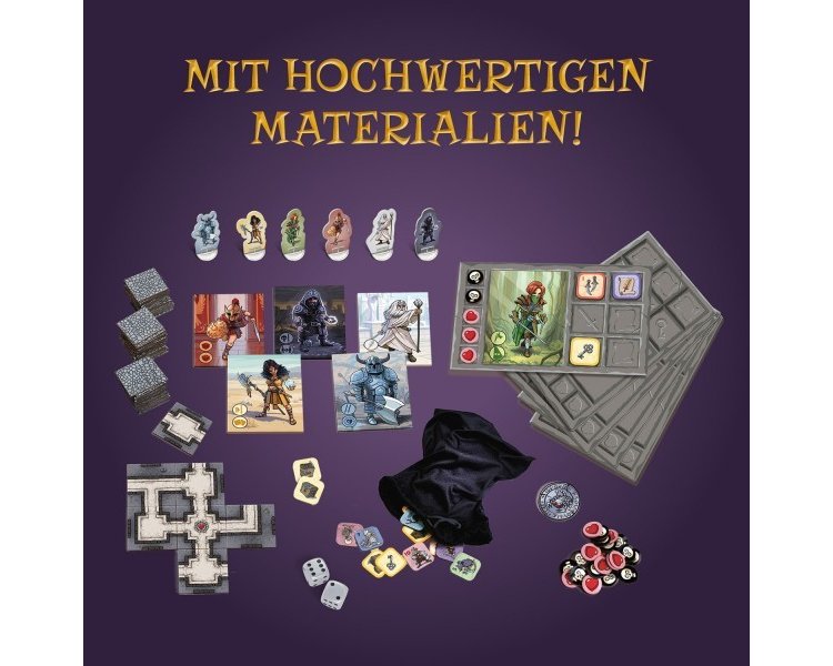 Inhalt: 80 Labyrinthfelder, 6 Heldenfiguren mit Standfüßen, 6 Heldenkarten, 5 Inventartableaus, 25 Lebenspunkte-Marker, 1 Beutel, 43 Monsterplättchen, 10 Schatztruhenplättchen, 2 Würfel, 1 Fluchmarker, 1 Spielanleitung