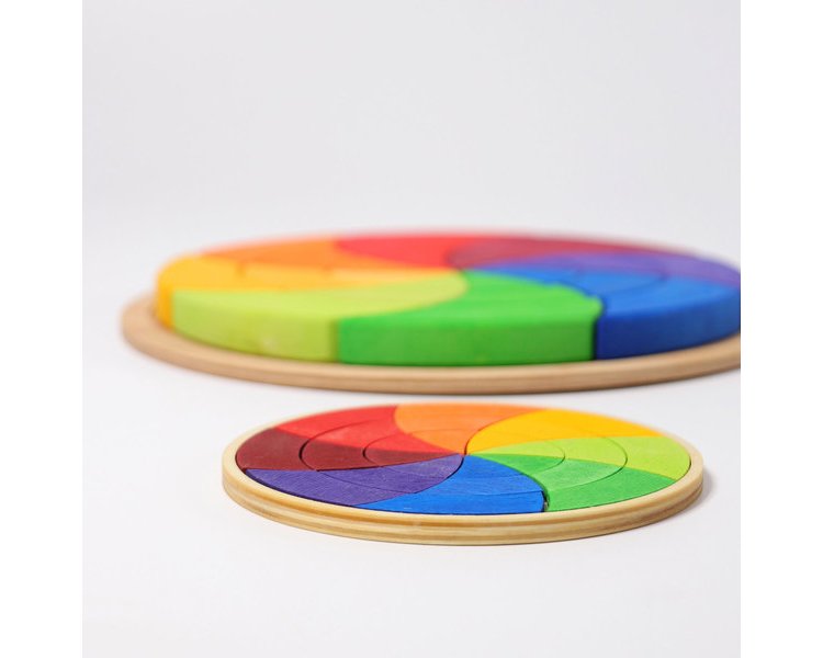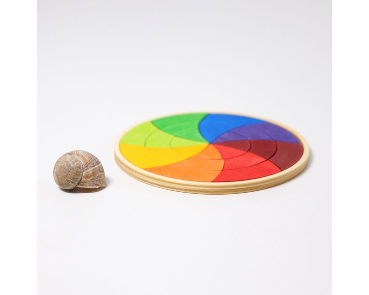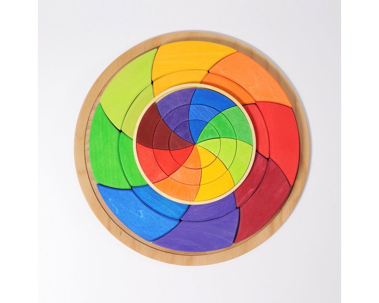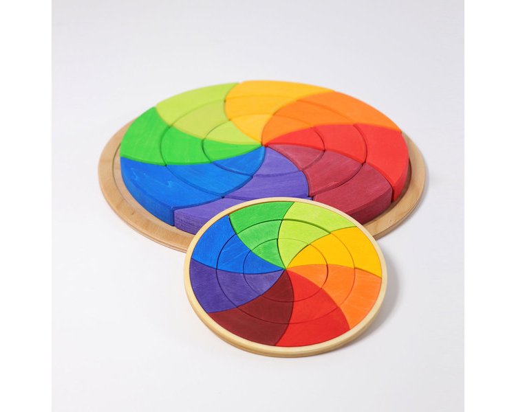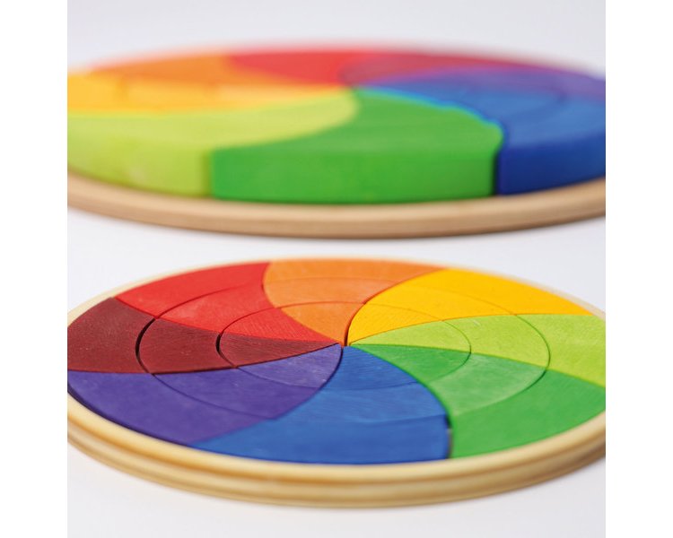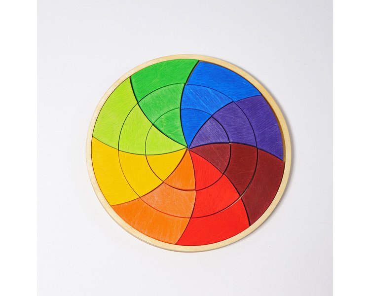 Durch die Achtteilung werden bei unserem Farbkreis Goethe zwei Rottöne und zwei Grüntöne gezeigt, die zusammengefasst gesehen werden können. Die Kinder lernen das Verhältnis der Farben untereinander, in dem sie einfach die Teile mischen und danach die Komplementärfarben gegenüber legen, oder die Mischfarben und reinen Farben nebeneinander legen und so den Kreis selbst schließen. Davor sollten die Kinder z.B. beim Mischen von Wasserfarben erleben wie aus Rot und Blau Lila wird. Beim fantasievollen Muster legen und Bauen mit den Puzzleteilen wird auf spielerische Weise das Gefühl für Farben und Formen gefördert und das räumliche Denken der Kinder geschult. 24 Teile im Holzrahmen.