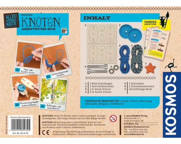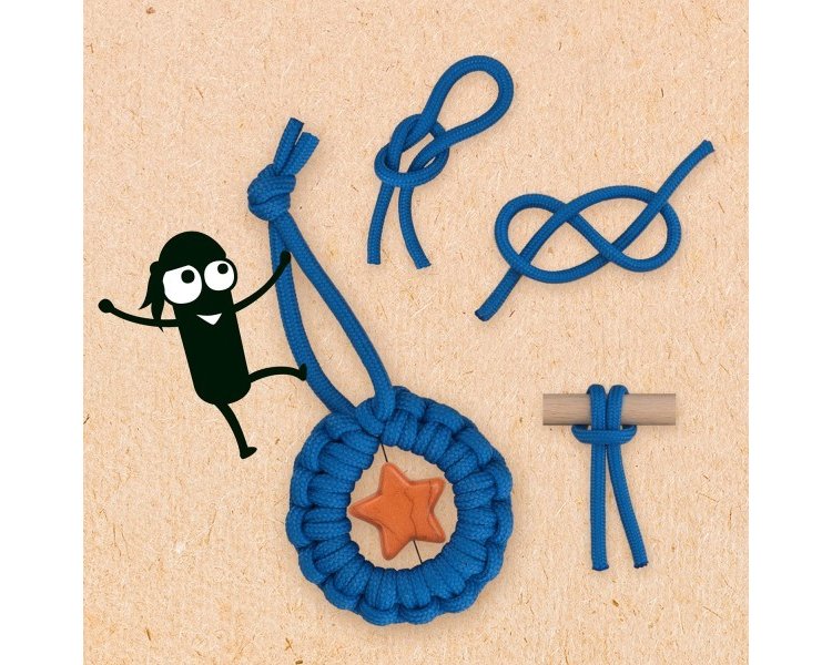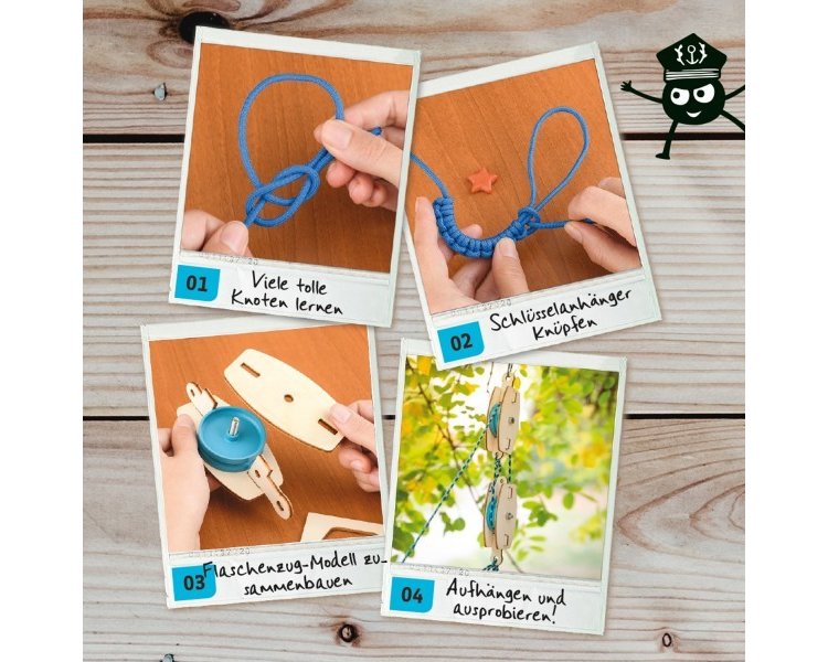 Lustige Knoten-Knobelei mit Überraschungsmoment! Palstek, Kreuzknoten und Co. – mit diesem coolen Bastelset lernen Kinder ab acht Jahren Schritt für Schritt die wichtigsten Knoten, die man fürs Leben braucht. Überraschung: Für das „Meisterstück“, einen selbstgeknüpften Schlüsselanhänger, können die neu erlernten Tricks gleich angewendet werden. Als besonderes Highlight enthält der Kasten ein tolles Flaschenzug-Modell aus Holz. So können die frisch gebackenen Knoten-Profis gleich noch ausprobieren, wie man mit wenig Kraft Dinge nach oben befördern kann.